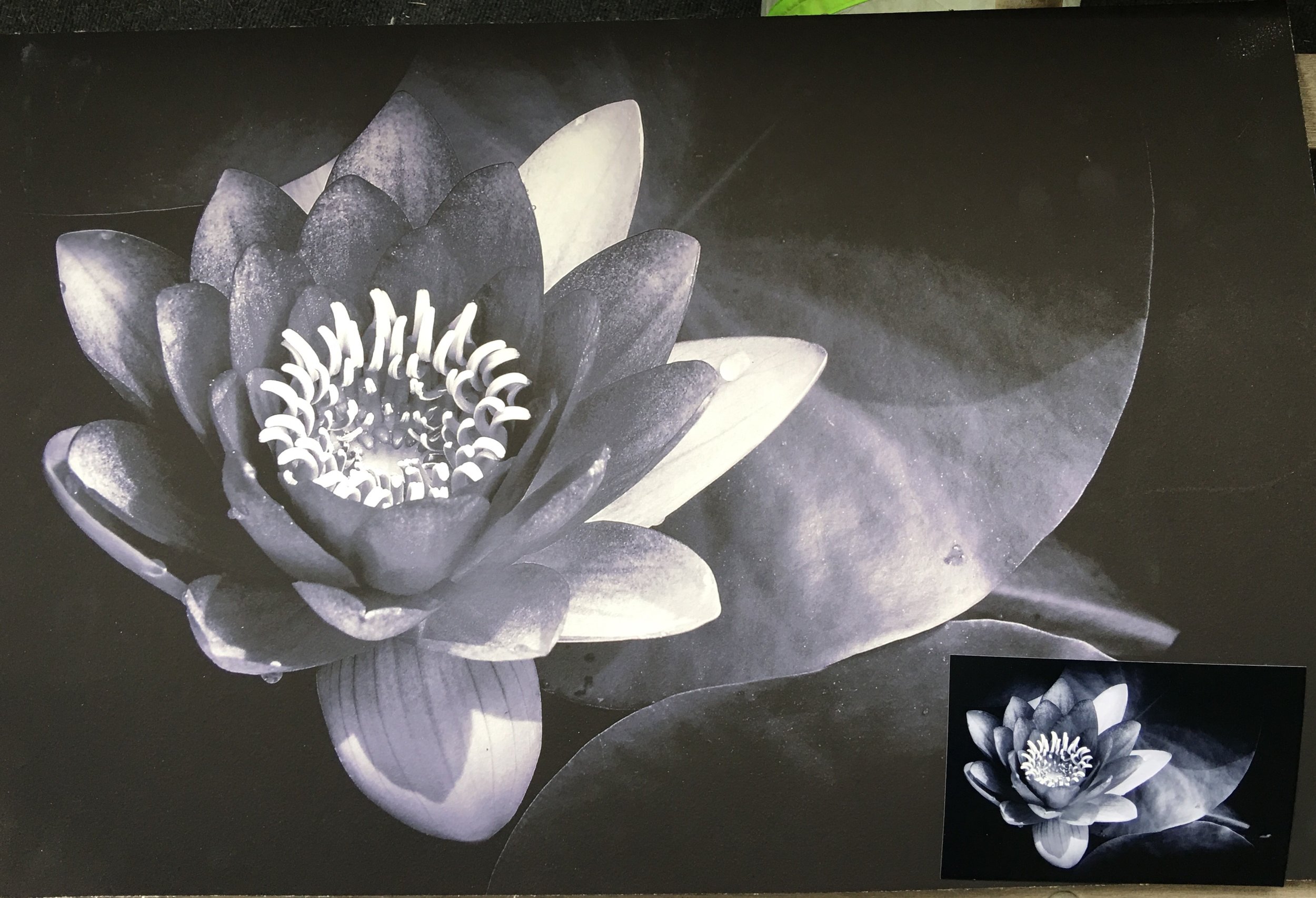 So here is what I envisioned; I wanted this water lily printed on watercolor paper by an inkjet printer and have the look of a photograph. You know that pop of contrast of darks and lights. I wanted then to have ruff torn edges and then float it in a matte and frame it. I was excited about the image I selected and the proof was perfect in the look I wanted. A week after I dropped it off I picked it up and instead of being excited I was disappointed. It was not the printers fault. The image matches the proof but it did not have that pop I was looking for. And why? Because it is the medium I printed on. What I wanted this paper to do was not going to happen. My concept for the image was spot on but the reality was that what I wanted was not happing. All is for not. I will still matte this print and sell it because it is a great print even though it doesn’t fit my needs. I will just make this image as well as the rest on photographic paper matte and frame them as normal and maybe explore this paper for other images later.